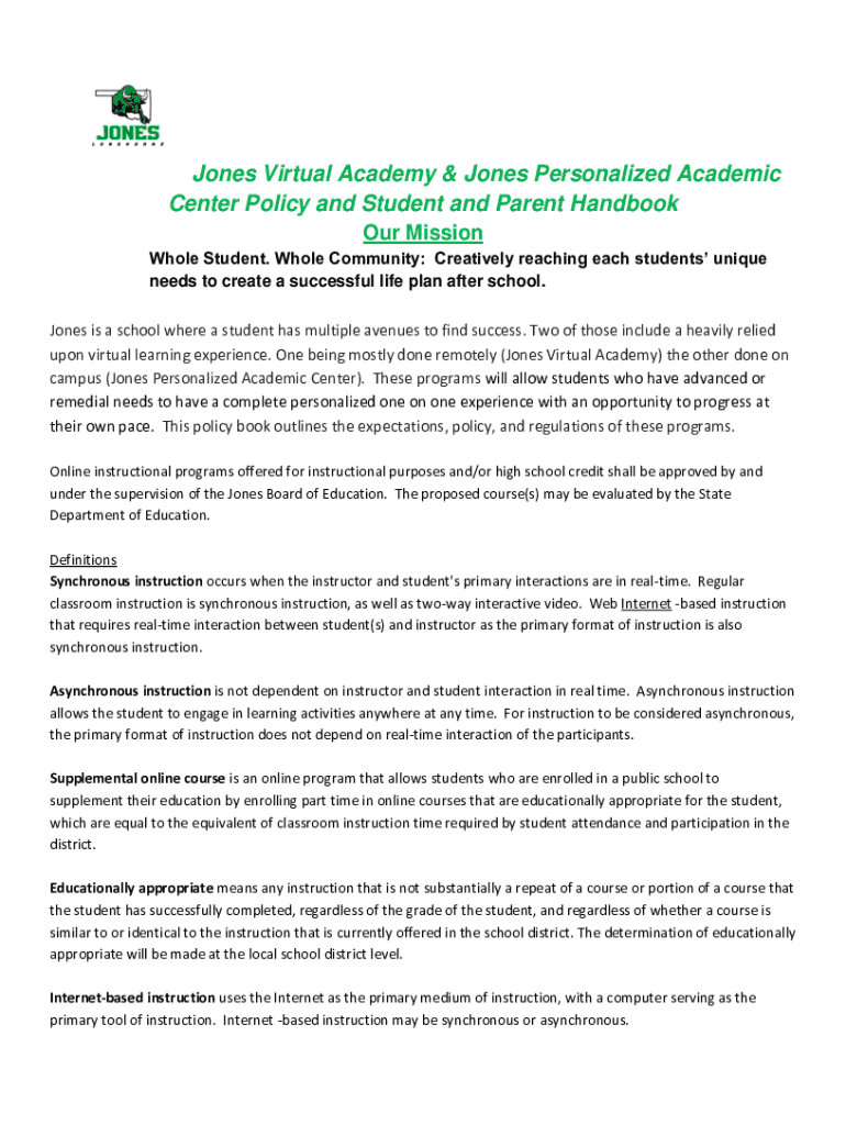 This handbook outlines the policies, expectations, and regulations for students and parents involved in the Jones Virtual Academy and the Jones Personalized Academic Center. The document emphasizes personalized learning experiences, guidelines for participation in online courses, attendance requirements, and the roles of students, parents, and instructors in ensuring educational success.