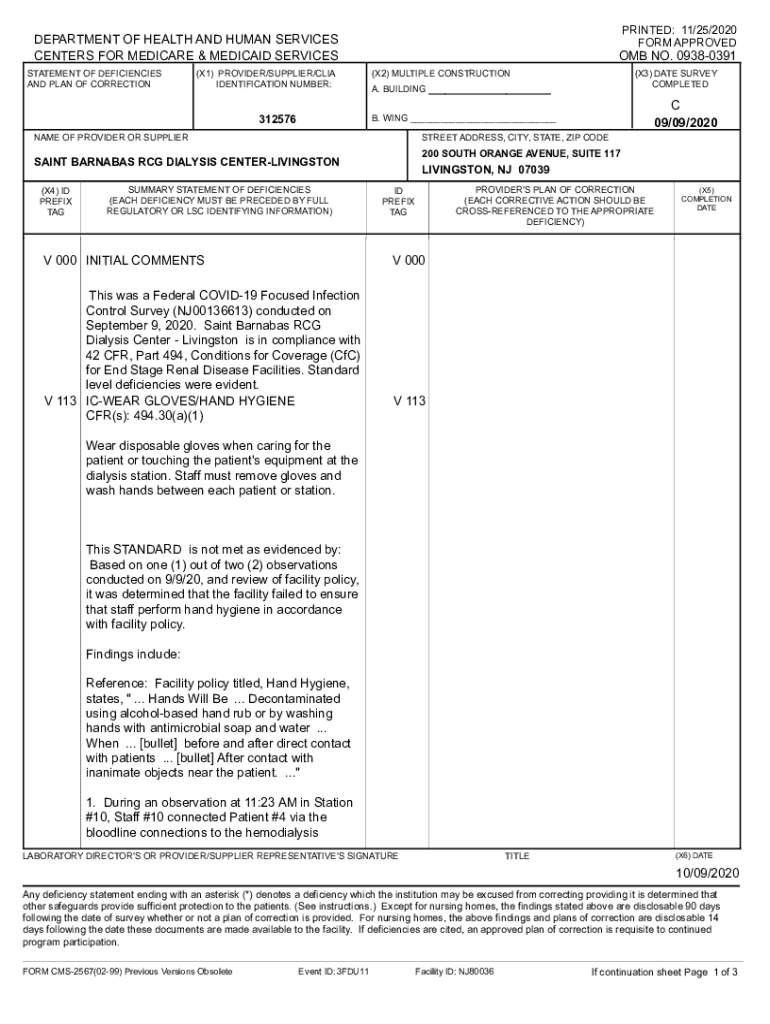 This document outlines the results of a Federal COVID-19 Focused Infection Control Survey conducted at the Saint Barnabas RCG Dialysis Center in Livingston, NJ, identifying several deficiencies related to infection control practices, particularly the failure to adhere to hand hygiene protocols and personal protective equipment guidelines.