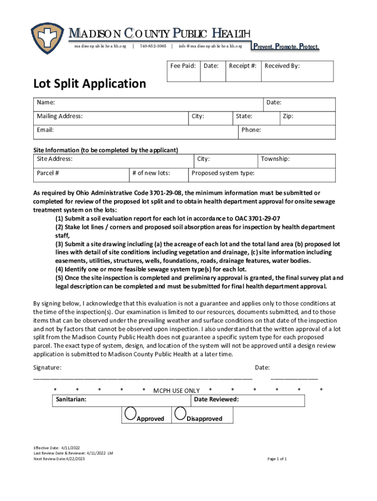MADISON COUNTY PUBLIC HEALTH madisonpublichealth.org| 7408523065 | info@madisonpublichealth.orgFee Paid:Date:Prevent. Promote. Protect.Receipt #:Received By:Lot Split Application Name:Date:Mailing