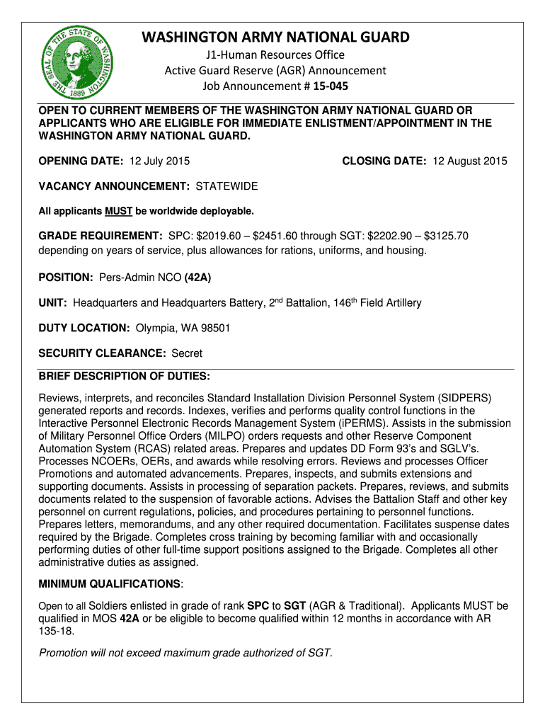 WASHINGTON ARMY NATIONAL GUARD J1? Human Resources Office Active Guard Reserve (AGR) Announcement Job Announcement # 15?045 OPEN TO CURRENT MEMBERS OF THE WASHINGTON ARMY NATIONAL GUARD OR APPLICANTS