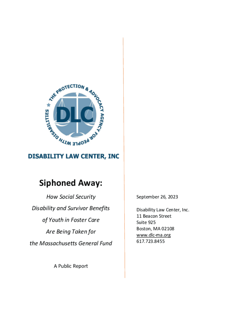 Siphoned Away: How Social Security Disability and Survivor Benefits of Youth in Foster Care Are Being Taken for the Massachusetts General FundA Public ReportSeptember 26, 2023 Disability Law Center,