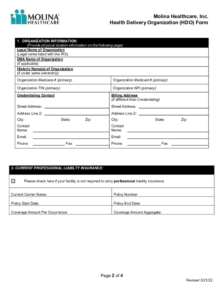 This form is designed for healthcare facilities seeking to deliver services under Molina Healthcare. It outlines the necessary information required for licensing and accreditation purposes, including organizational details, physical location information, professional liability insurance, and any relevant certifications or accreditation.
