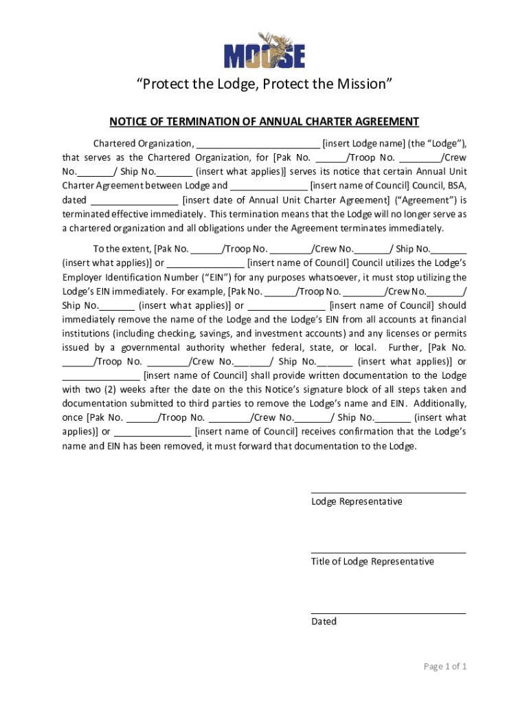 This document serves as a formal notice indicating the termination of the Annual Unit Charter Agreement between a Lodge and a local council of the Boy Scouts of America (BSA). The Lodge ceases to act as a chartered organization, detailing the requirements for disassociation from the Lodge’s Employer Identification Number (EIN) and the necessary steps for notification and compliance.