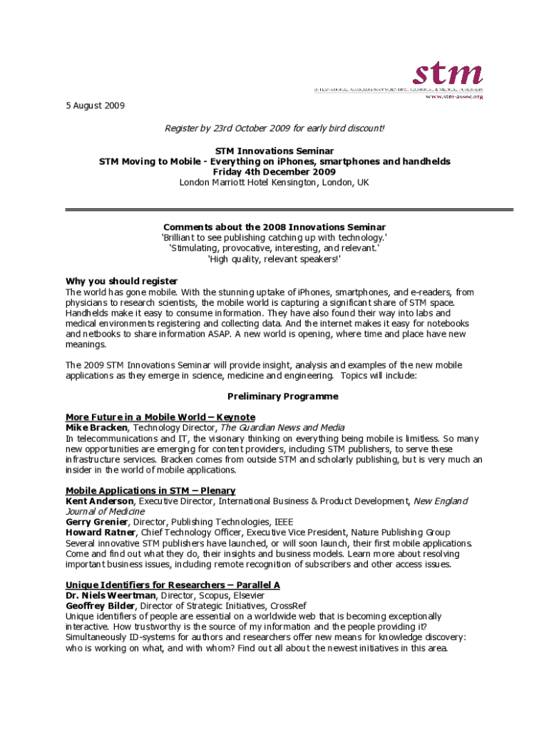 5 August 2009Register by 23rd October 2009 for early bird discount! STM Innovations Seminar STM Moving to Mobile Everything on iPhones, smartphones and handhelds Friday 4th December 2009 London Marriott
