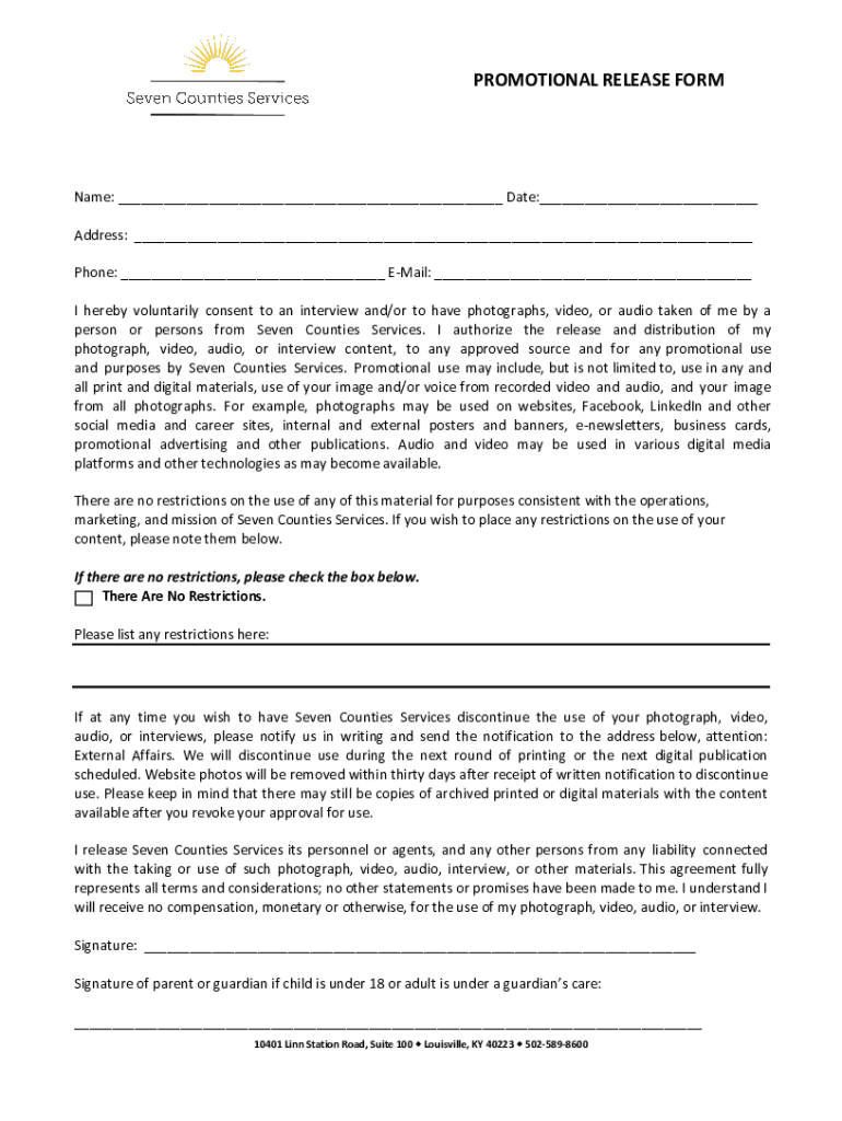 PROMOTIONAL RELEASE FORMName: ___ Date:___ Address: ___ Phone: ___ EMail: ___ I hereby voluntarily consent to an interview and/or to have photographs, video, or audio taken of me by a person or persons