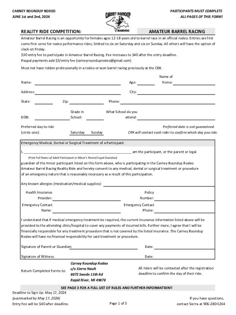 CARNEY ROUNDUP RODEO JUNE 1st and 2nd, 2024PARTICIPANTS MUST COMPLETE ALL PAGES OF THIS FORM!REALITY RIDE COMPETITION:AMATEUR BARREL RACINGAmateur Barrel Racing is an opportunity for females ages