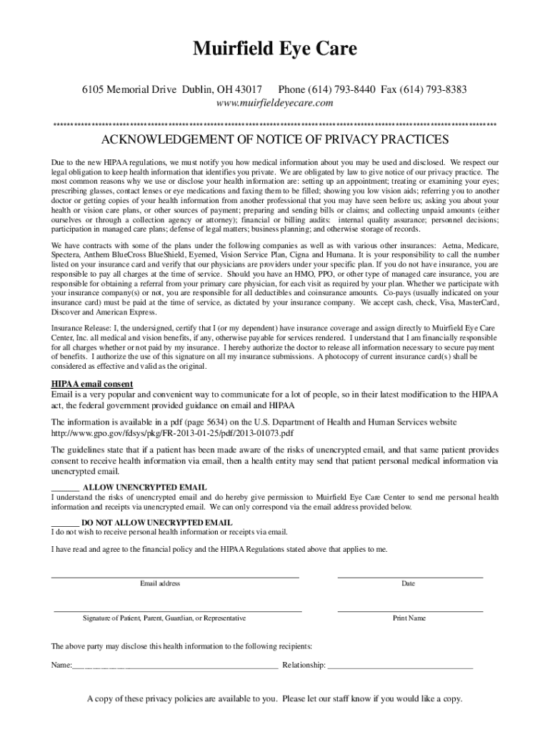 This document serves as an acknowledgment of the notice of privacy practices by Muirfield Eye Care, outlining how medical information may be used and disclosed as per HIPAA regulations. It details patient responsibilities regarding insurance, consent for email communication, and the financial policy.