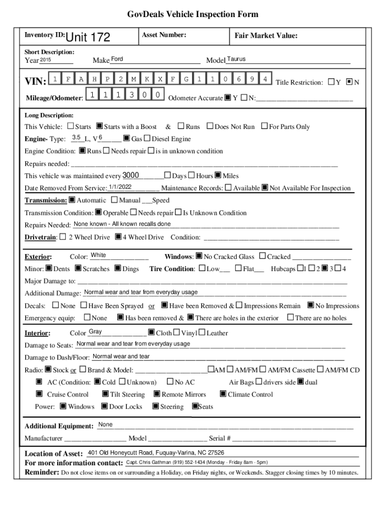 GovDeals Vehicle Inspection Form Inventory ID:Asset Number:Unit 172Fair Market Value:Short Description: Ford Taurus Make___ Model___2015 Year___1 Do F notAcloseH items P on2or surrounding M K Xa Holiday,