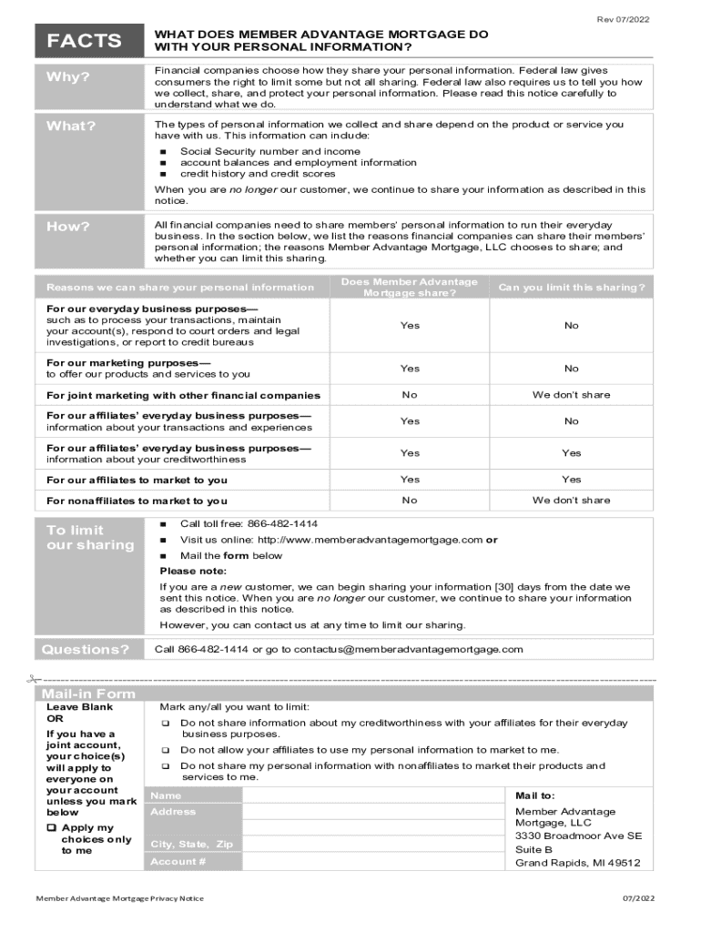 Rev 07/2022FACTSWHAT DOES MEMBER ADVANTAGE MORTGAGE DO WITH YOUR PERSONAL INFORMATION?Why?Financial companies choose how they share your personal information. Federal law gives consumers the right