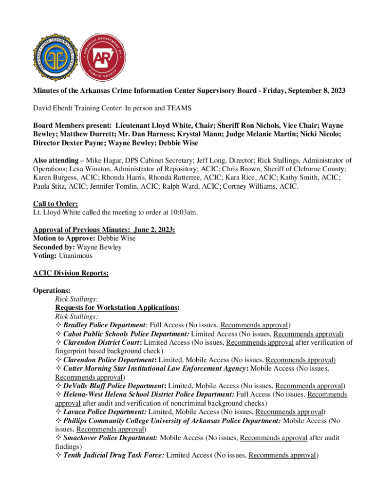 Minutes of the Arkansas Crime Information Center Supervisory Board Friday, September 8, 2023 David Eberdt Training Center: In person and TEAMS Board Members present: Lieutenant Lloyd White, Chair;