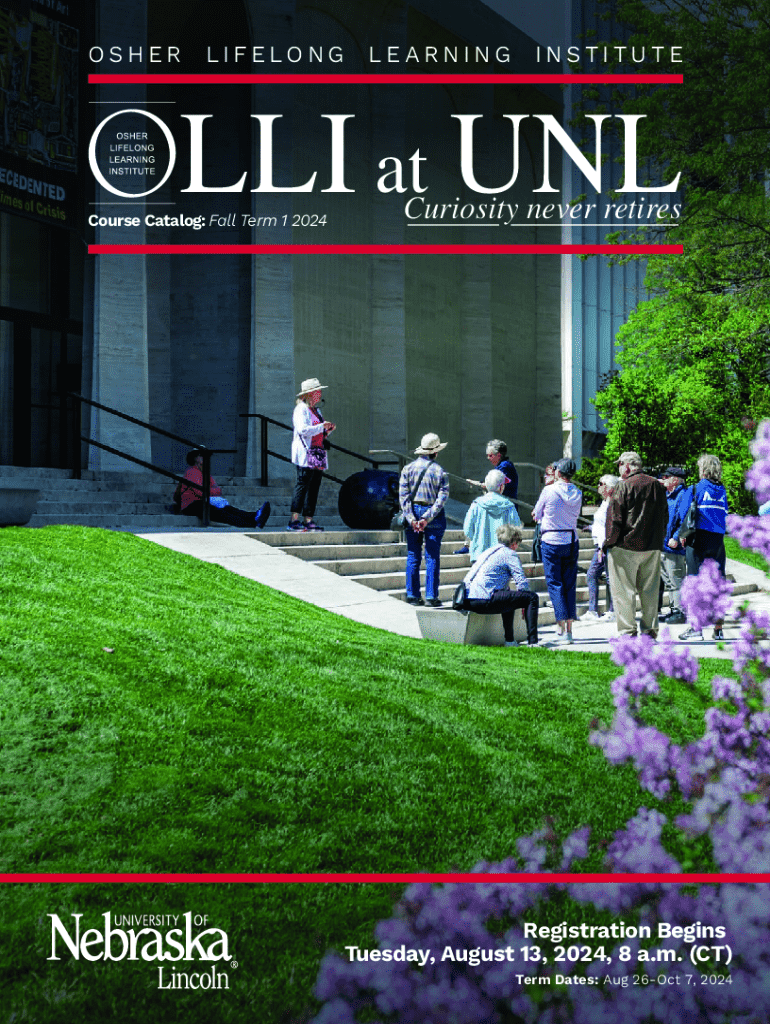 OSHERLIFELONGLEARNINGINSTITUTELLI at UNLCourse Catalog: Fall Term 1 2024Curiosity never retiresRegistration Begins Tuesday, August 13, 2024, 8 a.m. (CT) Term Dates: Aug 26Oct 7, 2024schedule at a