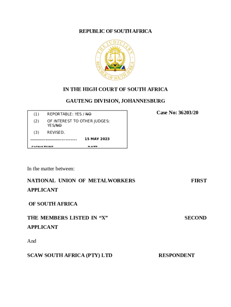 The National Union of Metal Workers of South Africa and Others ... is a document which can be filled-out and signed for specified needs. In that case, it is provided to the relevant addressee to provide certain info of certain kinds. The completion and signing may be done manually or using a trusted tool e. g. PDFfiller. These applications help to send in any PDF or Word file without printing them out. It also lets you customize it according to your needs and put a legal electronic signature. Once done, the user sends the National Union of Metal Workers of South Africa and Others ... to the recipient or several of them by mail and also fax. PDFfiller includes a feature and options that make your document of MS Word extension printable. It offers different settings for printing out. It doesn't matter how you will file a form - in hard copy or by email - it will always look professional and organized. In order not to create a new writable document from scratch all the time, turn the original Word file into a template. After that, you will have a rewritable sample.