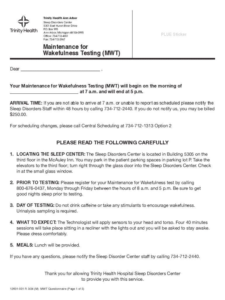 Trinity Health Ann Arbor Sleep Disorders Center 5301 East Huron River Drive P.O. Box 995 Ann Arbor, Michigan 481060995 Office: 7347124651 Fax: 7347122967PLUE StickerMaintenance for Wakefulness Testing