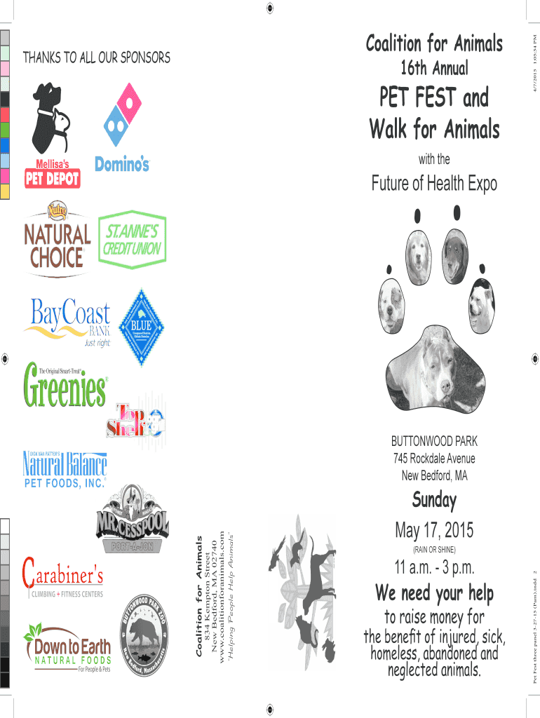 Coalition for Animals 16th Annual PET FEST and Walk for Animals 4/7/2015 1:05:34 PM THANKS TO ALL OUR SPONSORS with the WATER $1.00 SODA $2.00 Future of Health Expo BUTTONWOOD PARK 745 Rockdale Avenue