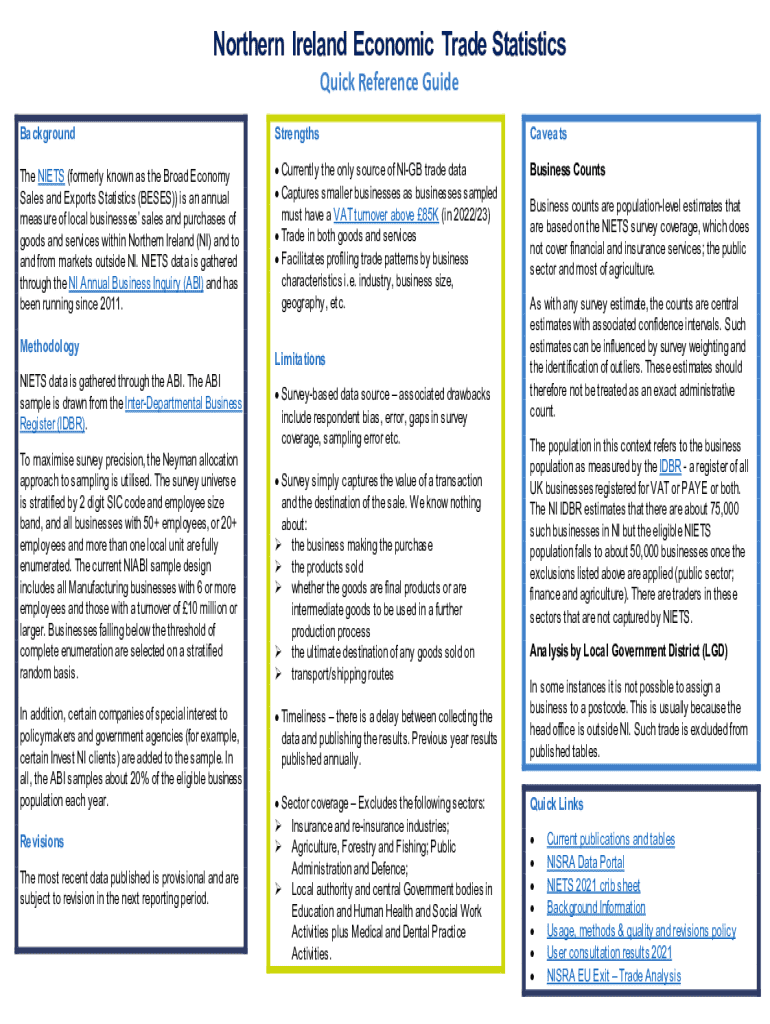 Northern Ireland Economic Trade Statistics Quick Reference GuideBackgroundStrengthsCaveatsThe NIETS (formerly known as the Broad Economy Sales and Exports Statistics (BESES)) is an annual measure