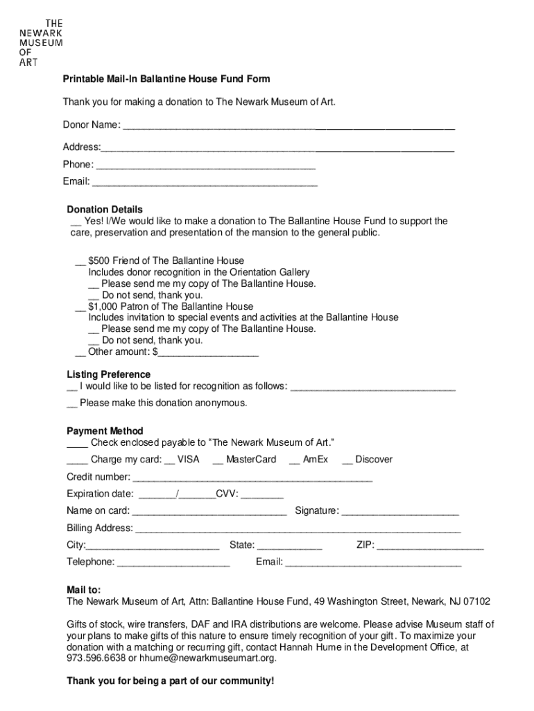 Printable MailIn Ballantine House Fund Form Thank you for making a donation to The Newark Museum of Art. Donor Name: ___ Address:___ Phone: ___ Email: ___ Donation Details __ Yes! I/We would like