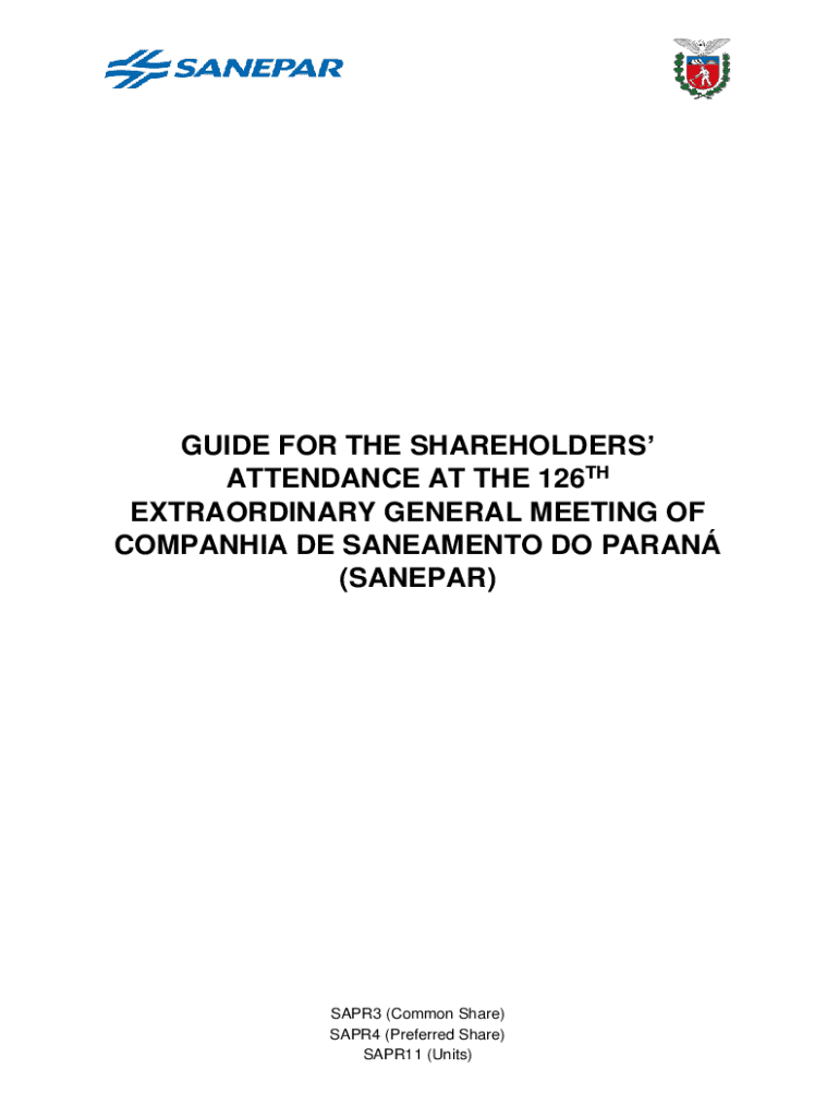 This guide aims to assist shareholders of Companhia de Saneamento do Paraná (SANEPAR) in voting and attending the 126th Extraordinary General Meeting, outlining necessary documents, attendance procedures, and remote voting options. It emphasizes the importance of shareholder participation and adherence to corporate governance practices.