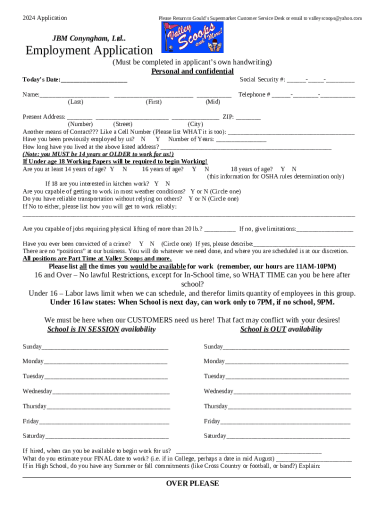 The Employment Application - Valley Scoops & More is a Word document that has to be completed and signed for certain purposes. In that case, it is provided to the actual addressee in order to provide some details of any kinds. The completion and signing can be done manually in hard copy or with an appropriate tool e. g. PDFfiller. These tools help to submit any PDF or Word file without printing them out. While doing that, you can customize its appearance for your requirements and put a valid digital signature. Once you're good, the user ought to send the Employment Application - Valley Scoops & More to the recipient or several recipients by mail or fax. PDFfiller includes a feature and options that make your Word template printable. It has various settings for printing out appearance. It does no matter how you'll distribute a form after filling it out - physically or by email - it will always look well-designed and organized. To not to create a new editable template from the beginning again and again, make the original Word file into a template. After that, you will have a customizable sample.