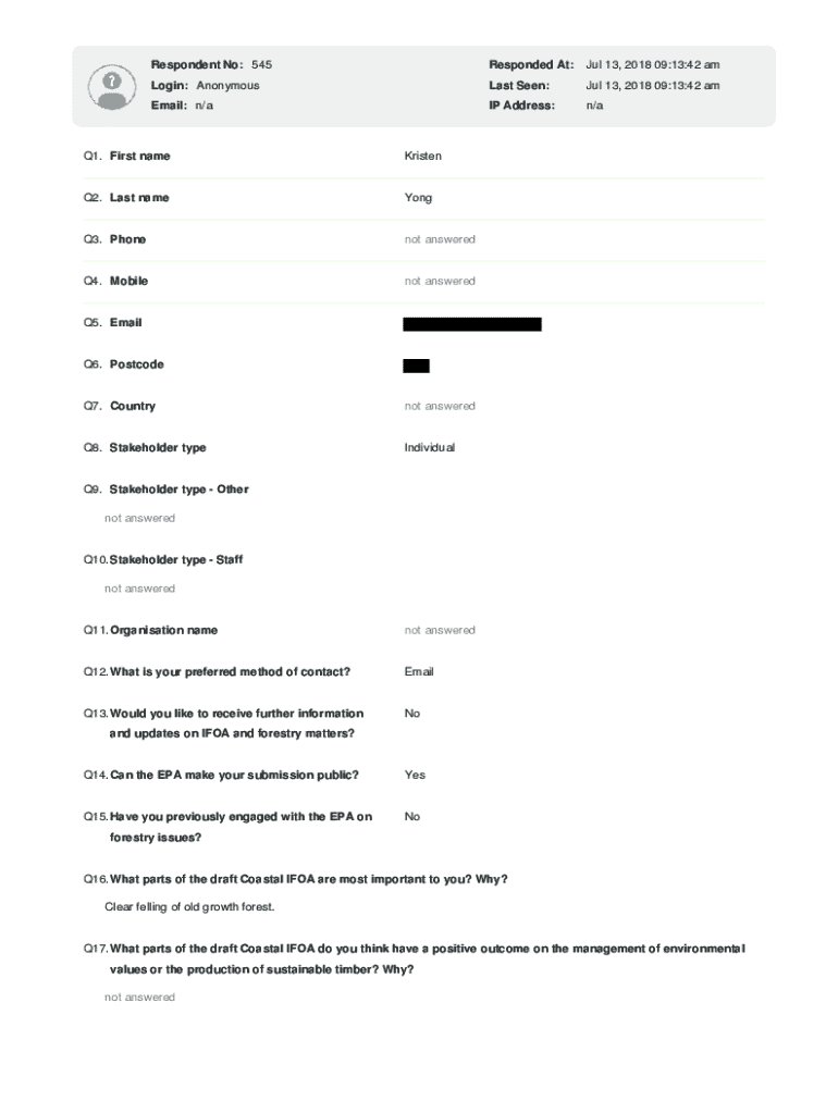 Respondent No: 545Responded At:Jul 13, 2018 09:13:42 amLogin: AnonymousLast Seen:Jul 13, 2018 09:13:42 amEmail: n/aIP Address:n/aQ1. First nameKristenQ2. Last nameYongQ3. Phonenot answeredQ4. Mobilenot