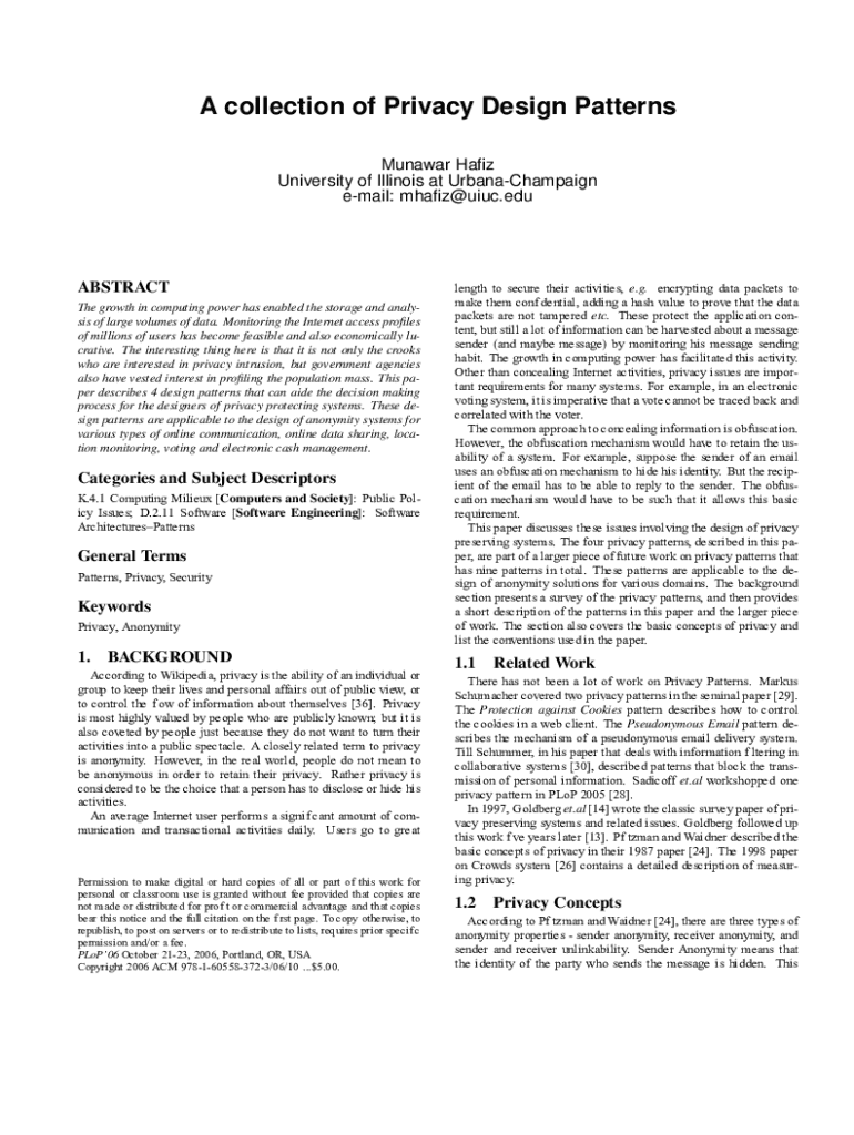 A collection of Privacy Design Patterns Munawar Hafiz University of Illinois at UrbanaChampaign email: mhafiz@uiuc.eduABSTRACT The growth in computing power has enabled the storage and analysis of