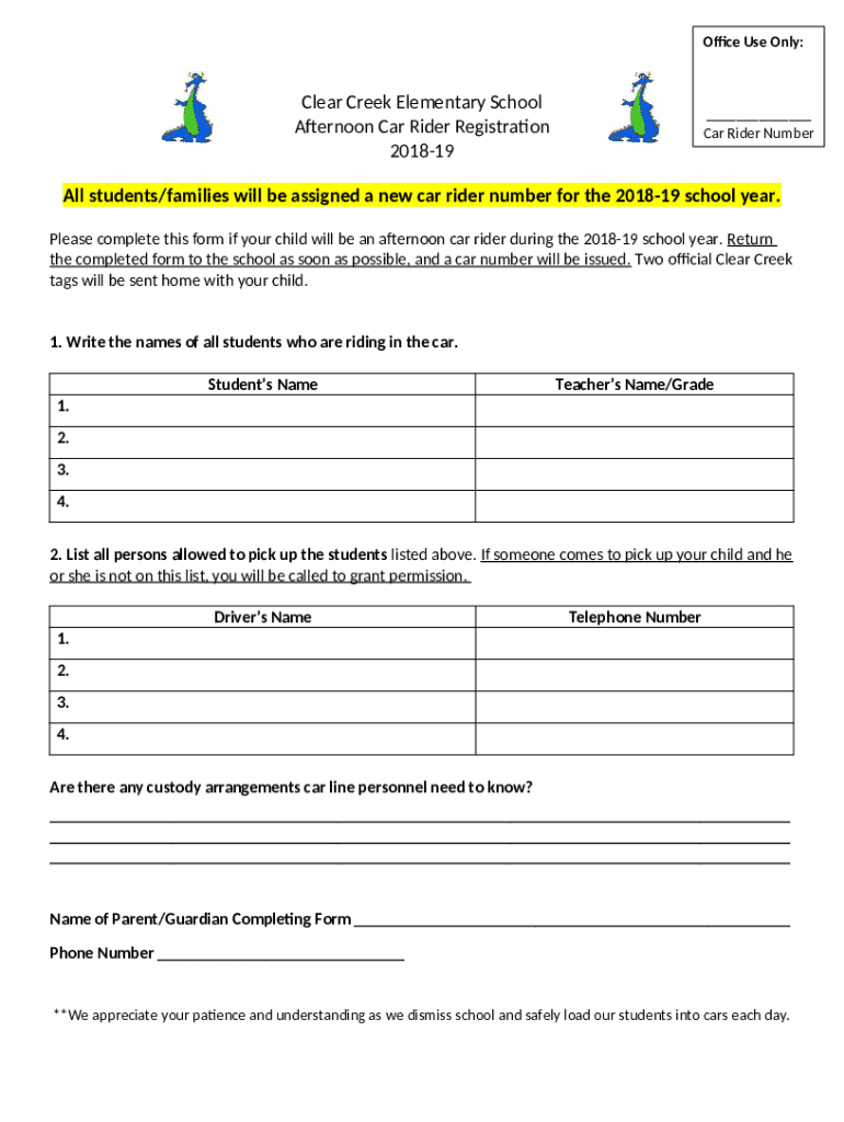 Afternoon Car Rider Registration template instructions