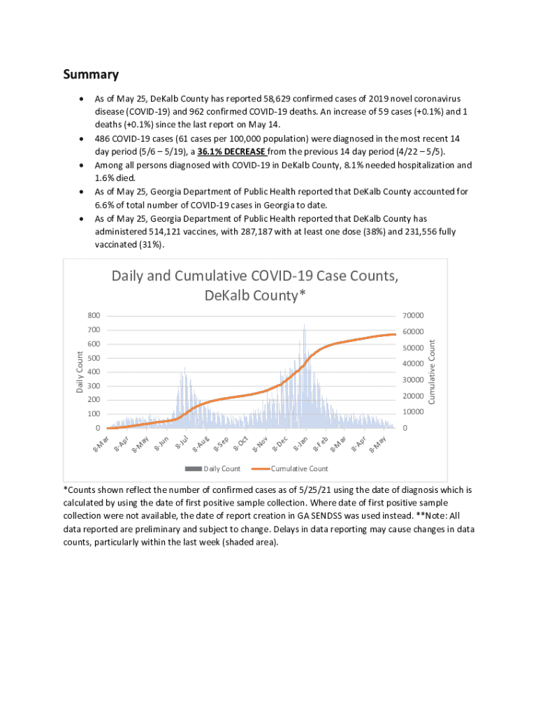 Summary As of May 25, DeKalb County has reported 58,629 confirmed cases of 2019 novel coronavirus disease (COVID19) and 962 confirmed COVID19 deaths. An increase of 59 cases (+0.1%) and 1 deaths (+0.1%)