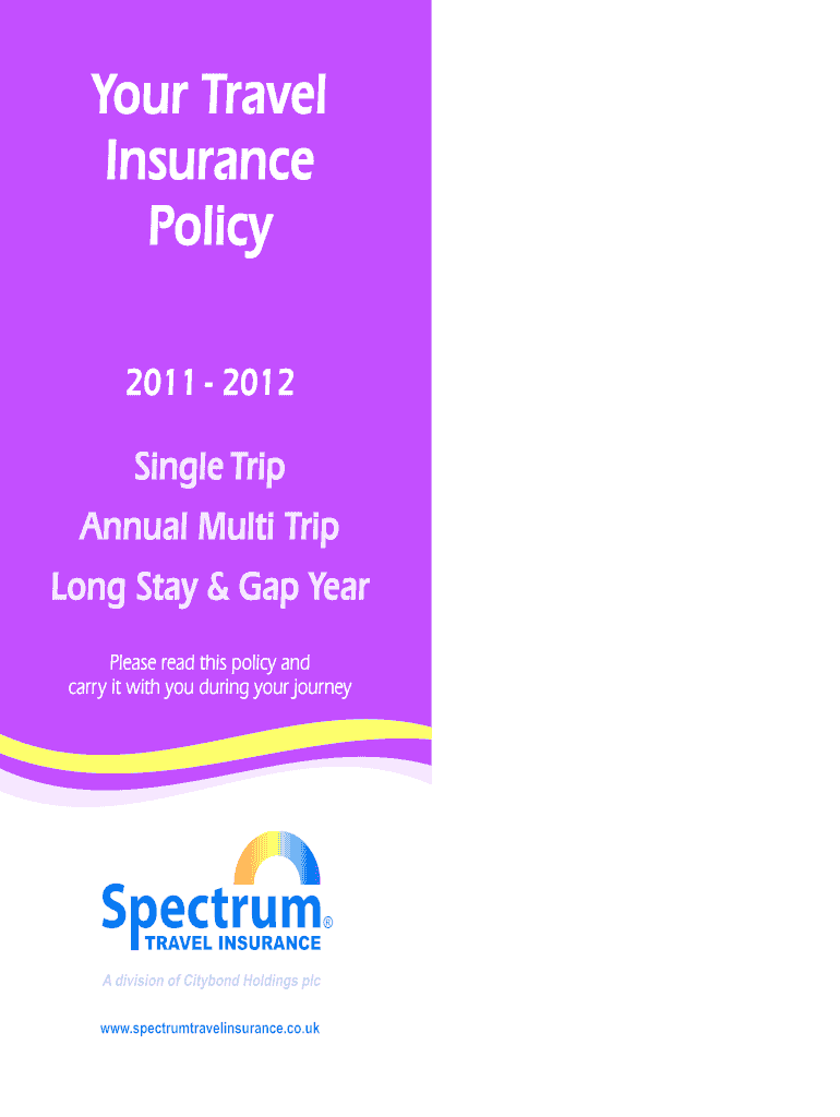 Your Travel Insurance Policy 2011 2012 Single Trip Annual Multi Trip Long Stay & Gap Year Please read this policy and carry it with you during your journey www.spectrumtravelinsurance.co.uk About