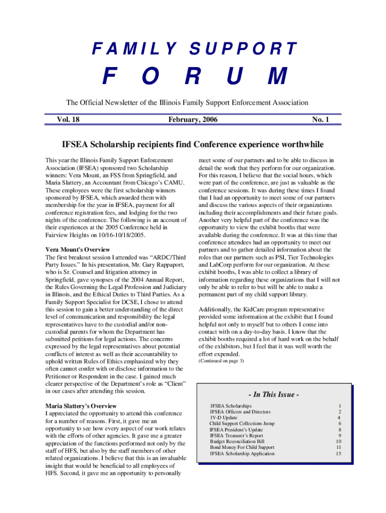 This document is the official newsletter of the Illinois Family Support Enforcement Association (IFSEA), detailing scholarships awarded, conference experiences, updates on child support collections, and the efforts of the division within Illinois to enhance family support enforcement.