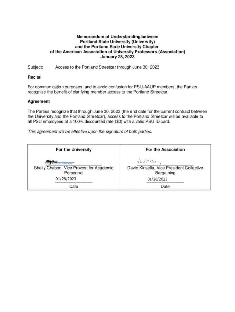 Memorandum of Understanding between Portland State University (University) and the Portland State University Chapter of the American Association of University Professors (Association) January 28,