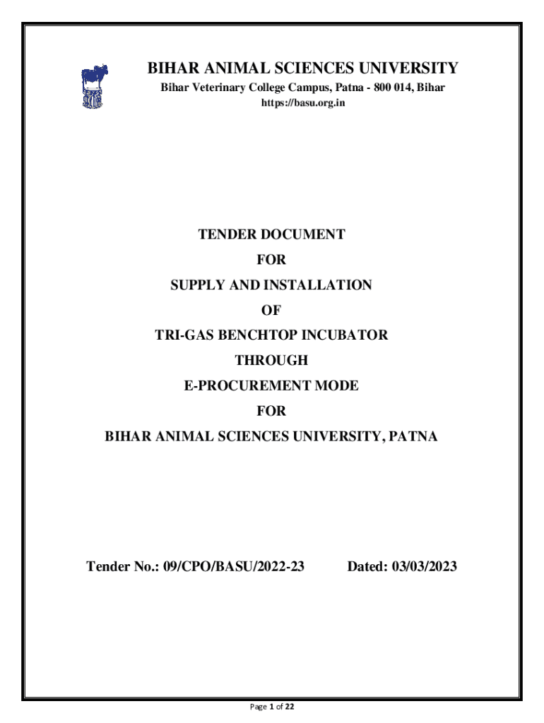 BIHAR ANIMAL SCIENCES UNIVERSITY Bihar Veterinary College Campus, Patna 800 014, Bihar https://basu.org.inTENDER DOCUMENT FOR SUPPLY AND INSTALLATION OF TRIGAS BENCHTOP INCUBATOR THROUGH EPROCUREMENT