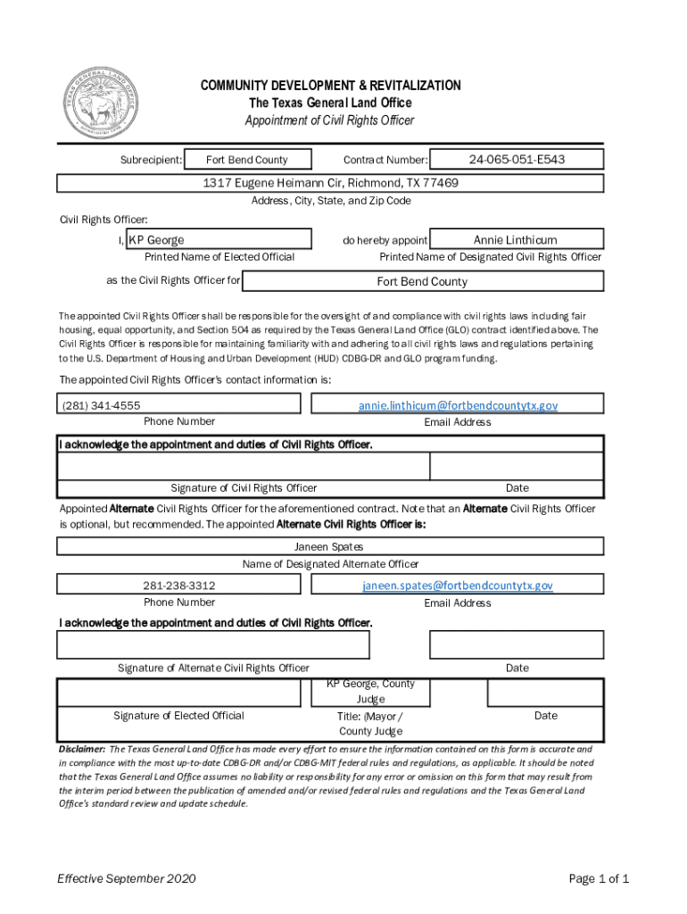 COMMUNITY DEVELOPMENT & REVITALIZATION The Texas General Land Office Appointment of Civil Rights Officer Subrecipient:Contract Number:Fort Bend County24065051E5431317 Eugene Heimann Cir, Richmond,