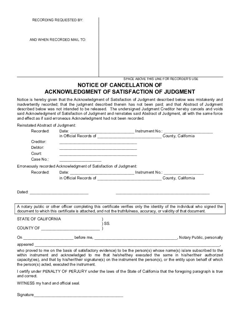 RECORDING REQUESTED BY:AND WHEN RECORDED MAIL TO:SPACE ABOVE THIS LINE FOR RECORDERS USENOTICE OF CANCELLATION OF ACKNOWLEDGMENT OF SATISFACTION OF JUDGMENT Notice is hereby given that the Acknowledgment
