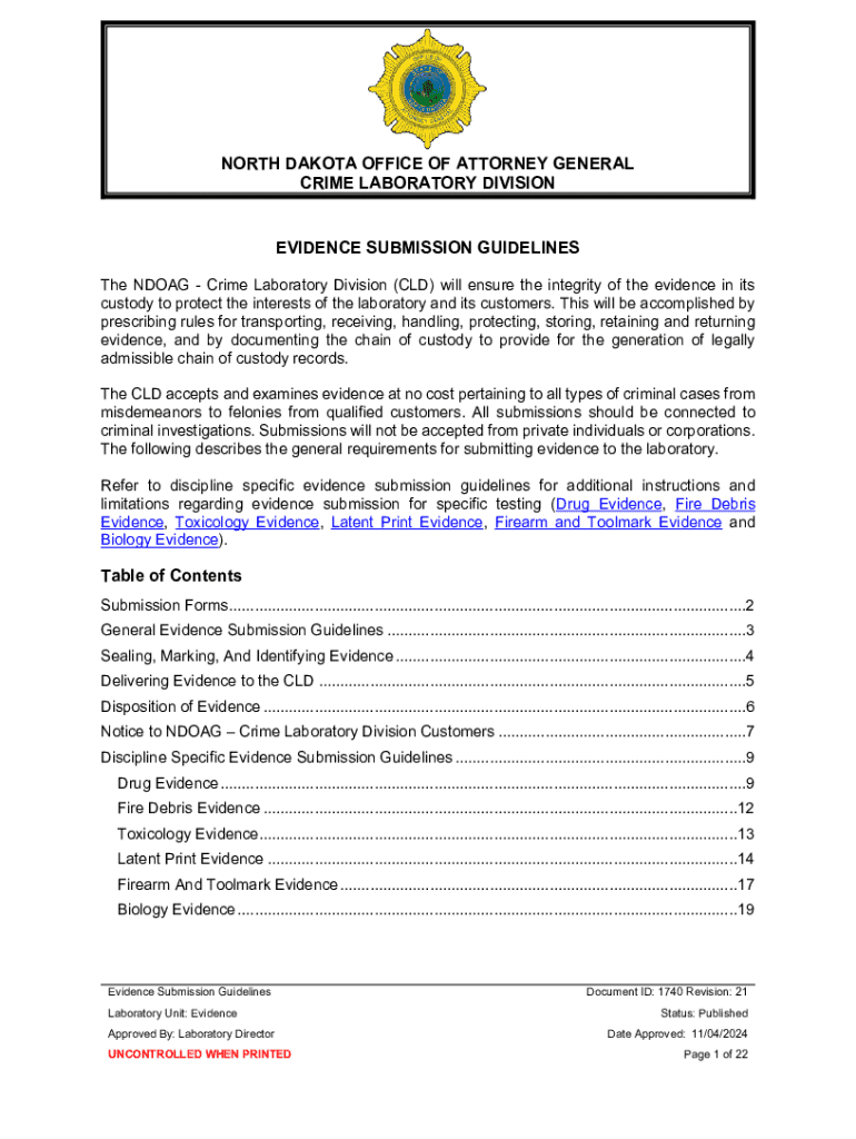 This document outlines the guidelines for submitting evidence to the North Dakota Office of Attorney General - Crime Laboratory Division. It provides detailed instructions on maintaining evidence integrity, including procedures for transport, handling, and documentation of chain of custody for various types of evidence related to criminal investigations. It specifies submission forms, general requirements, and discipline-specific guidelines for drug evidence, fire debris, toxicology, latent...
