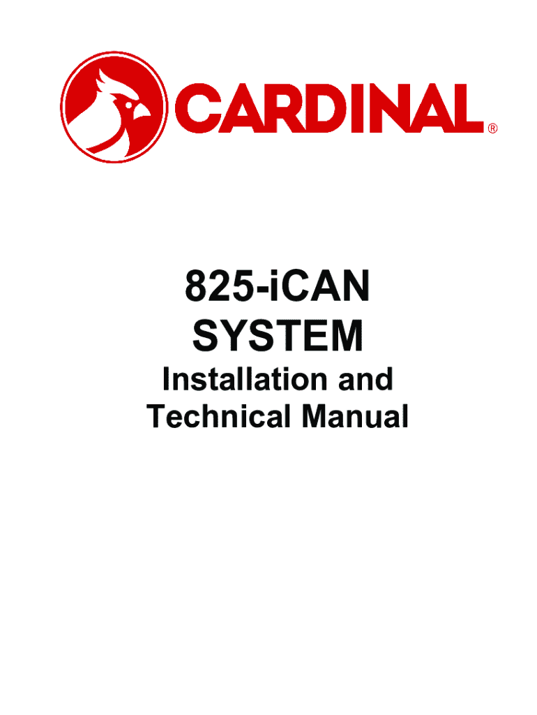 This manual provides comprehensive instructions for the installation, setup, and calibration of the Cardinal 825-iCAN System, a technologically advanced weighing and diagnostic scale system that utilizes digital electronics and ISP flash microcontrollers connected via a CAN serial bus.