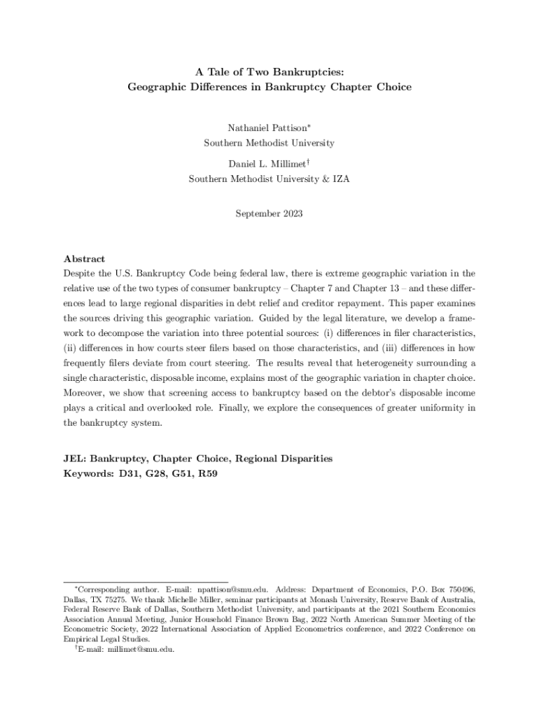 A Tale of Two Bankruptcies: Geographic Differences in Bankruptcy Chapter ChoiceNathaniel Pattison Southern Methodist University Daniel L. Millimet Southern Methodist University & IZASeptember 2023Abstract