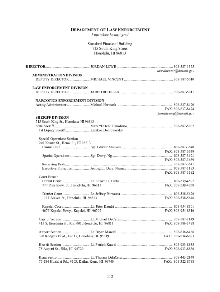 DEPARTMENT OF LAW ENFORCEMENT https://law.hawaii.gov/Standard Financial Building 715 South King Street Honolulu, HI 96813 DIRECTOR..................................................JORDAN LOWE ..............................................................