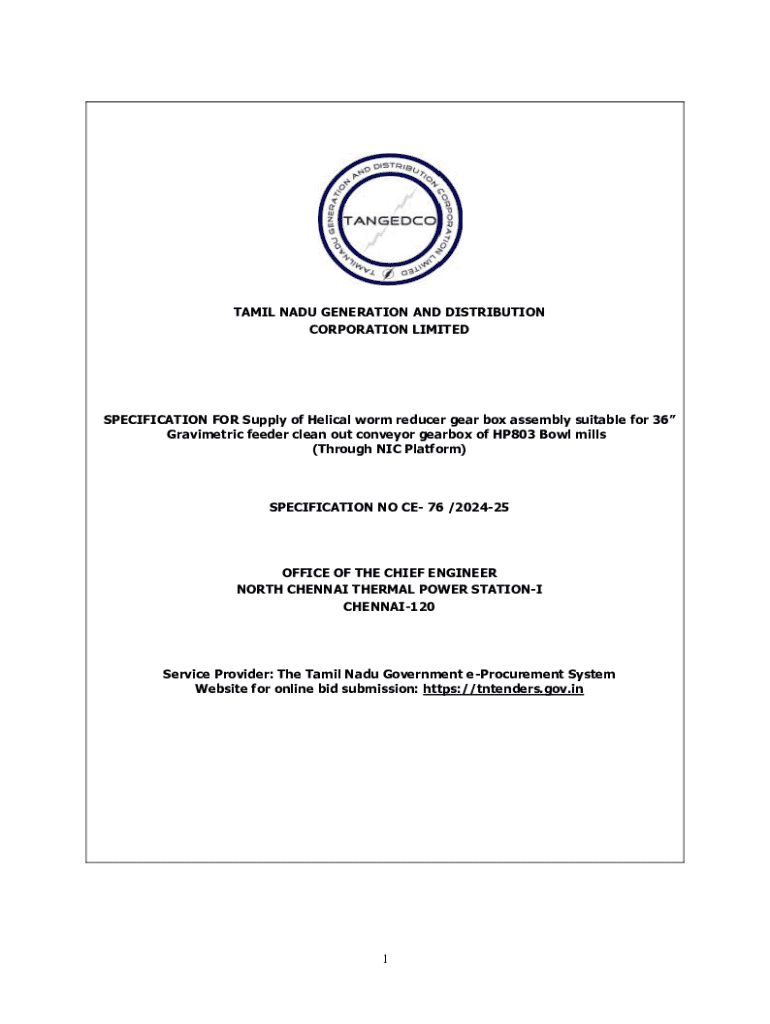 TAMIL NADU GENERATION AND DISTRIBUTION CORPORATION LIMITEDSPECIFICATION FOR Supply of Helical worm reducer gear box assembly suitable for 36 Gravimetric feeder clean out conveyor gearbox of HP803