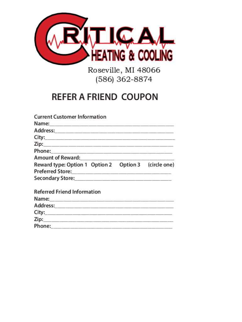 A coupon form designed for current customers to refer friends for rewards based on the referral.