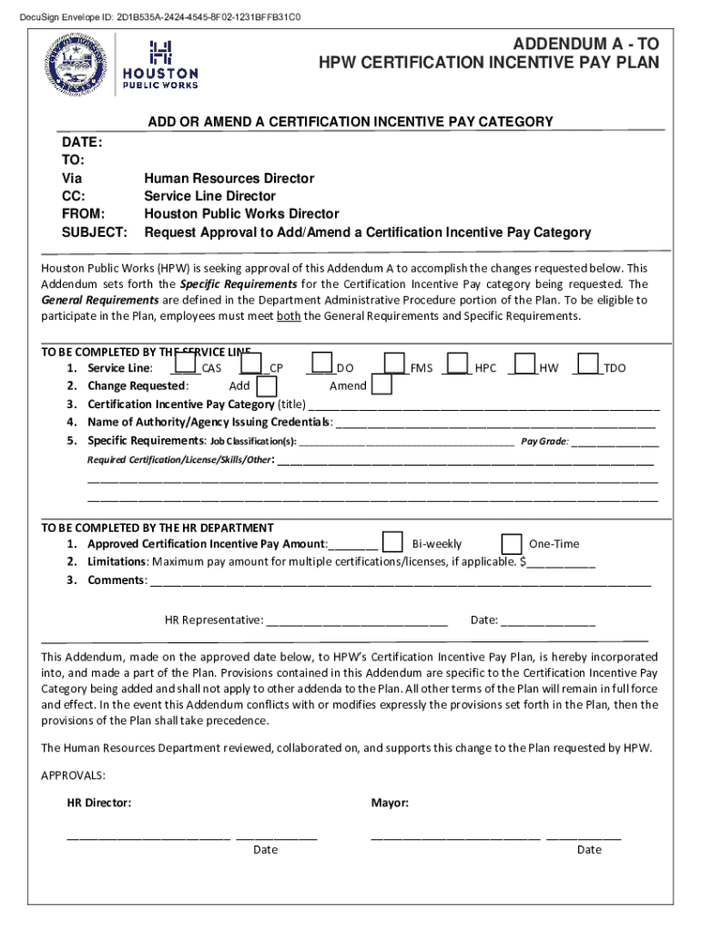 This document is an addendum to the Houston Public Works Certification Incentive Pay Plan, requesting approval to add or amend a certification incentive pay category. It outlines specific requirements, the service line involved, and the certification details necessary for employees to qualify for the incentive pay. It also includes sections for approvals from Human Resources and the Mayor.
