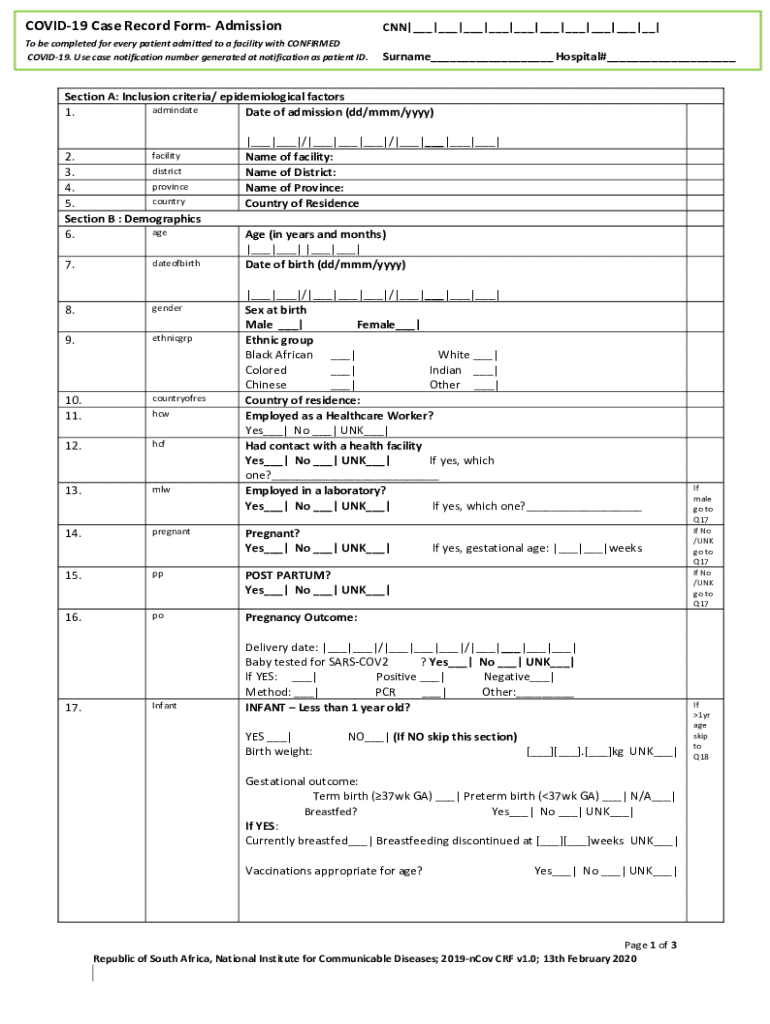 COVID19 Case Record Form AdmissionCNN|___|___|___|___|___|___|___|___|___|__|To be completed for every patient admitted to a facility with CONFIRMED COVID19. Use case notification number generated