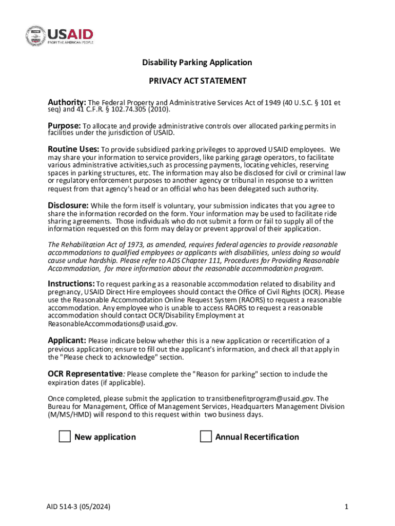 Disability Parking Application PRIVACY ACT STATEMENT Authority: The Federal Property and Administrative Services Act of 1949 (40 U.S.C. 101 et seq) and 41 C.F.R. 102.74.305 (2010).Purpose: To allocate
