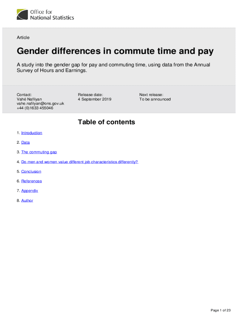 ArticleGender differences in commute time and pay A study into the gender gap for pay and commuting time, using data from the Annual Survey of Hours and Earnings.Contact: Vah Nafilyan vahe.nafilyan@ons.gov.uk