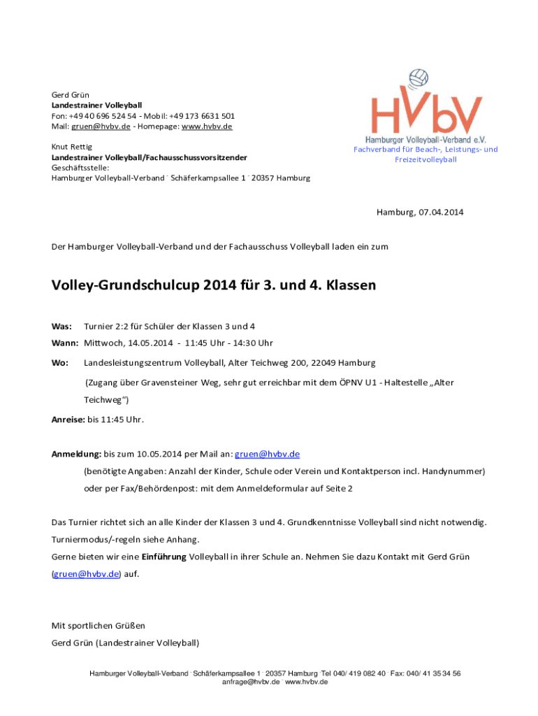 Gerd Grn Landestrainer Volleyball Fon: +49 40 696 524 54 Mobil: +49 173 6631 501 Mail: gruen@hvbv.de Homepage: www.hvbv.de Knut Rettig Landestrainer Volleyball/Fachausschussvorsitzender Geschftsstelle: