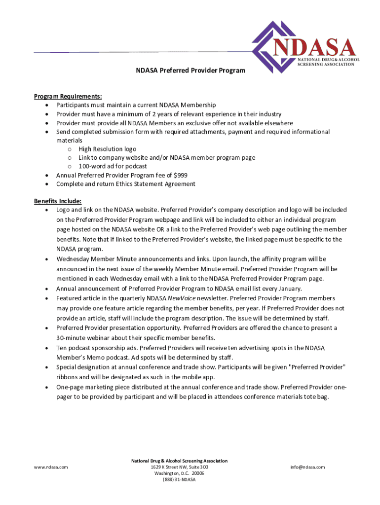 The NDASA Preferred Provider Program outlines the requirements and benefits for providers who want to join the program, which includes marketing opportunities, promotional support, and visibility within the National Drug & Alcohol Screening Association\'s network. Providers must meet specific criteria and pay an annual fee to participate.