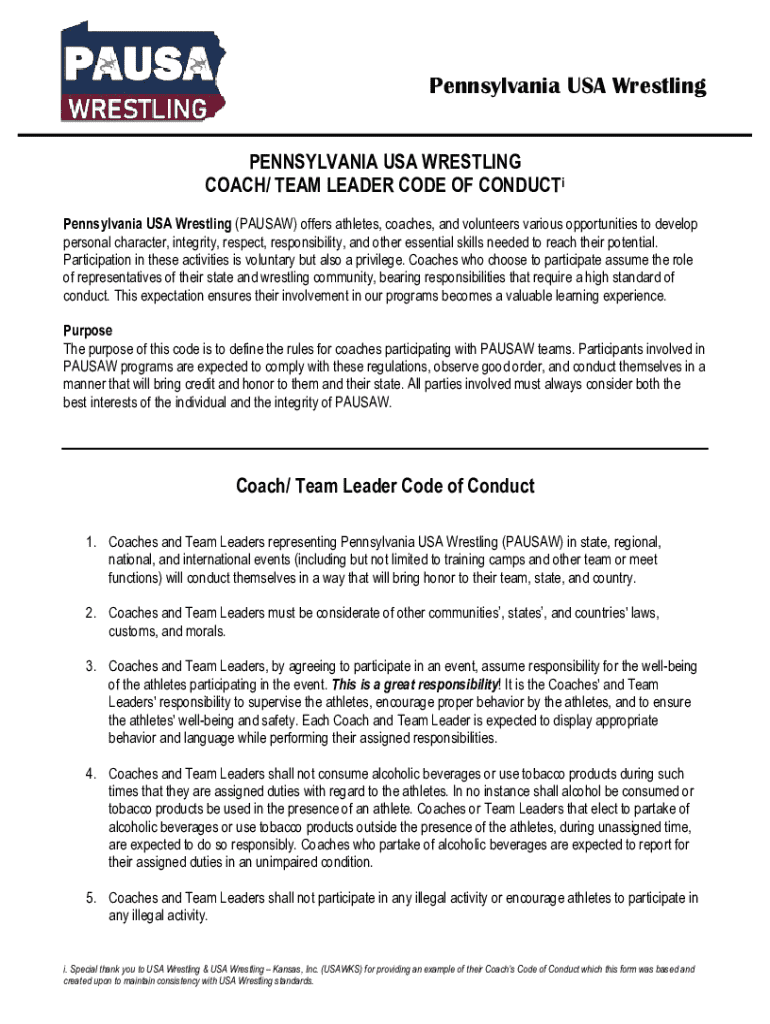 This document outlines the expectations and responsibilities for coaches and team leaders participating in Pennsylvania USA Wrestling activities. It emphasizes the importance of character, integrity, and a positive environment for athletes while detailing specific conduct standards to ensure the safety and well-being of all participants.