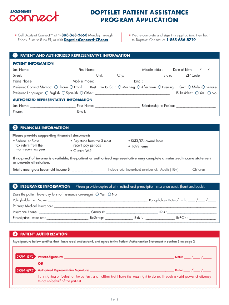 Patients who meet specific financial criteria and require assistance to access Doptelet are required to file for the Doptelet Patient Assistance Program.