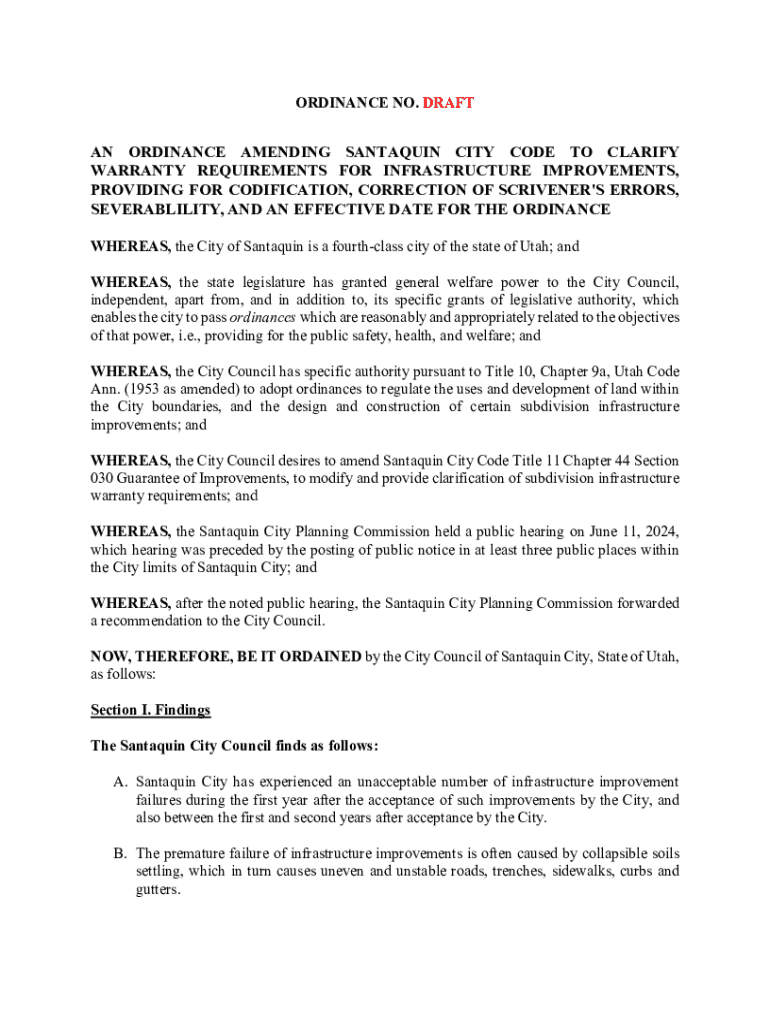 This ordinance amends the Santaquin City Code to clarify warranty requirements for infrastructure improvements, including the guarantee process for subdivision improvements, forms of guarantee, warranty periods, and procedural requirements for developers. It addresses issues of infrastructure failures and allows the city to ensure quality and compliance before accepting improvements.
