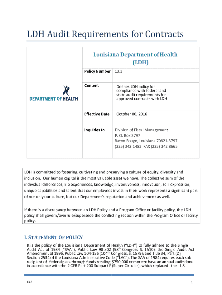 LDH Audit Requirements for Contracts Louisiana Department of Health (LDH)Policy Number 13.3 ContentDefines LDH policy for compliance with federal and state audit requirements for approved contracts