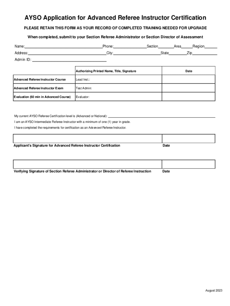 This document is an application form for individuals seeking certification as an Advanced Referee Instructor within the AYSO organization. It requires the applicant\'s personal details, certification level, and signatures from both the applicant and a verifying official.