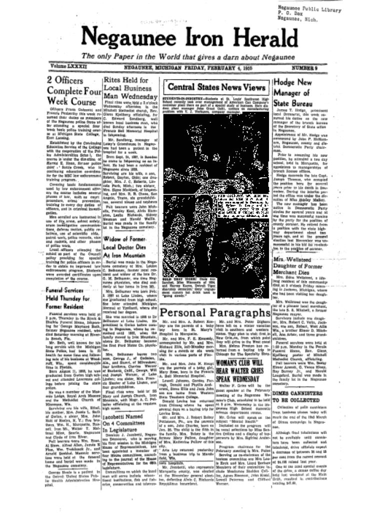 Negaunoe Public P. 0. Box Negaunee, Mich.N egau nee Iron H erald ___The only Paper in the W orld that gives a darn about NegauneeVolume LXXXH___NEGAUNEE, MICHIGAN FRIDAY, FEBRUARY 4, 1955Rites Held